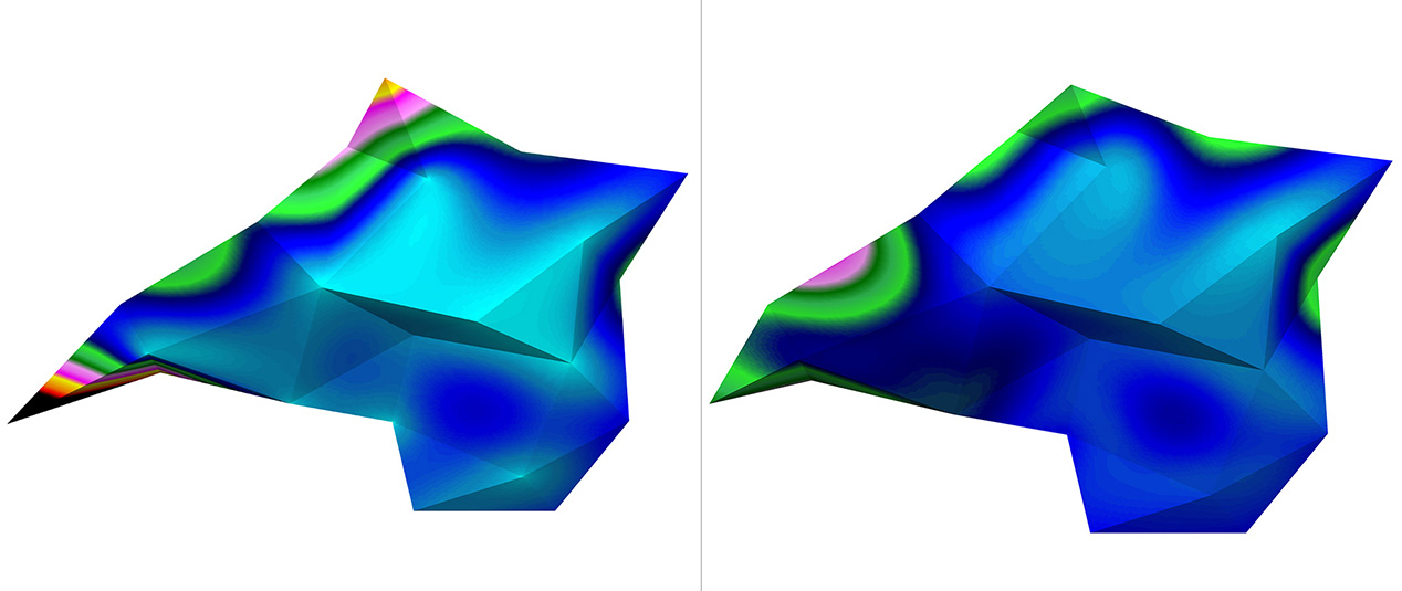 At first, shape optimization was performed to reduce deflection, resulting in a highly arched initial design. After introducing the cost variable, the refined design proved to be much flatter in order to reduce the overall surface area and thus the amount of composite material needed.