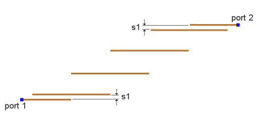 A microstrip bandpass filter is modeled in FEKO to determine its S-parameters.